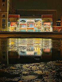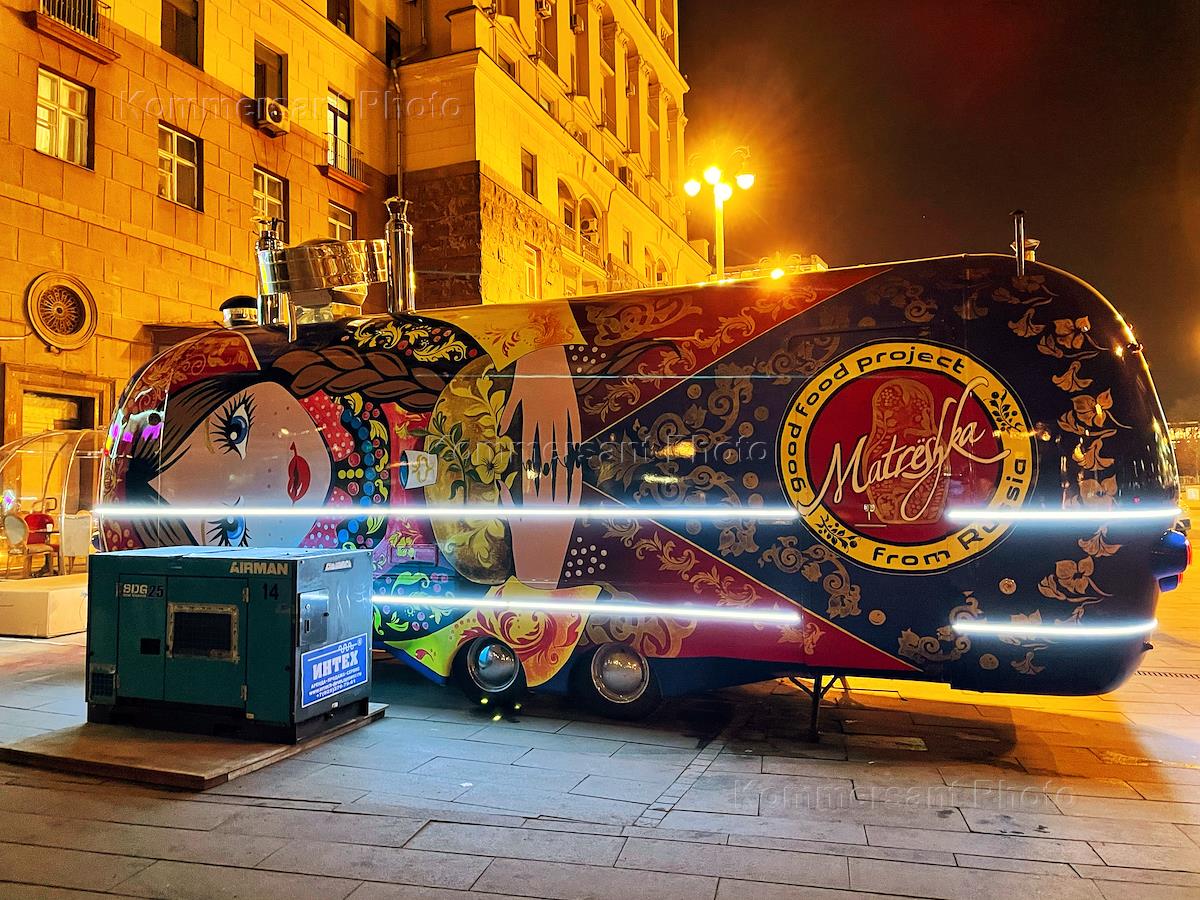 Виды вечерней Москвы. Жанровая фотография. Фуд-трак "Матрешка" на Тверской улице рядом с закрытым рестораном быстрого питания McDonald's.