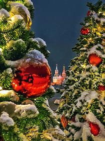 Жанровая фотография. Виды Москвы. Новогодняя елка с игрушками. Собор Покрова Пресвятой Богородицы (храм Василия Блаженного) и Спасская башня Кремля.