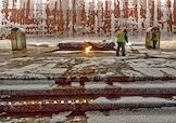 Жанровая фотография. Виды Москвы. Снегопад в городе. Уборка снега у "Вечного огня" мемориала Могила неизвестного солдата в Александровском саду.