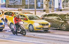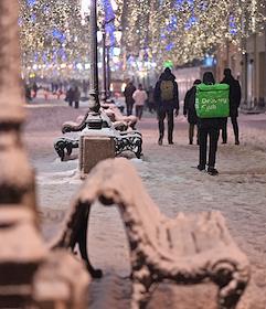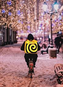 Виды Москвы. Жанровая фотография. Курьер службы доставки еды "Яндекс.Еда" на велосипеде.