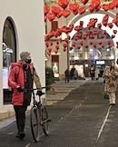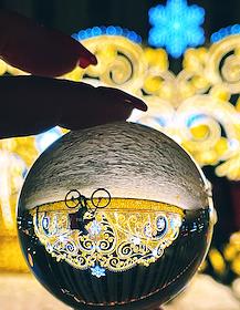 Виды Москвы. Жанровая фотография. Отражение велосипедиста и новогодней световой декорации в елочном шаре.