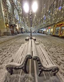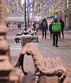 Виды Москвы. Жанровая фотография. Скамейки, занесенные снегом, на Никольской улице.