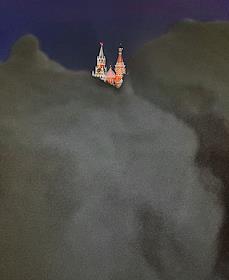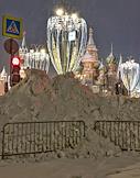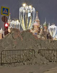 Виды МОсквы. Жанровая фотография. Спасская башня и купола собора Покрова Пресвятой Богородицы (храм Василия Блаженного), и снежный сугроб.