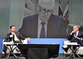 XIII съезд Национального союза производителей молока (Союзмолоко) в ивент-пространстве "Согласие Hall". Министр сельского хозяйства России Дмитрий патрушев (слева) и генеральный директор Союза производителей молока (Союзмолоко) Артем Белов (справа) во время работы съезда.