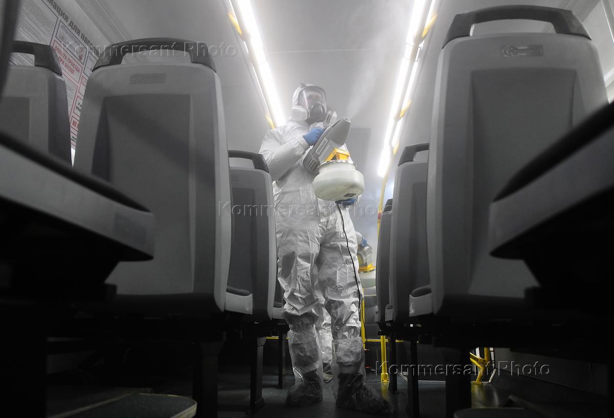 Measures to limit the spread of coronavirus infection COVID-19. Disinfection treatment of shuttle buses of the bus depot of Bars-2 LLC in the city of Sertolovo.