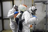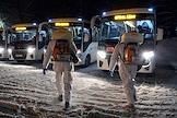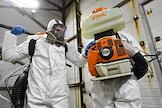 Меры по ограничению распространения коронавирусной инфекции COVID-19. Дезинфекционная обработка маршрутных автобусов автобусного парка ООО "Барс-2" в городе Сертолово. Специалисты перед началом дезинфекции.