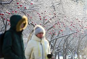 Виды Новосибирска во время морозов. Жанровая фотография. Новогодние красные шары на деревьях в парке.