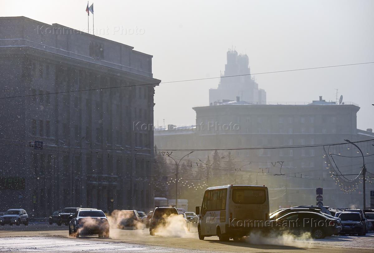 Виды Новосибирска во время морозов. Жанровая фотография. Движение автомобилей по улицам города.