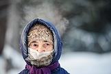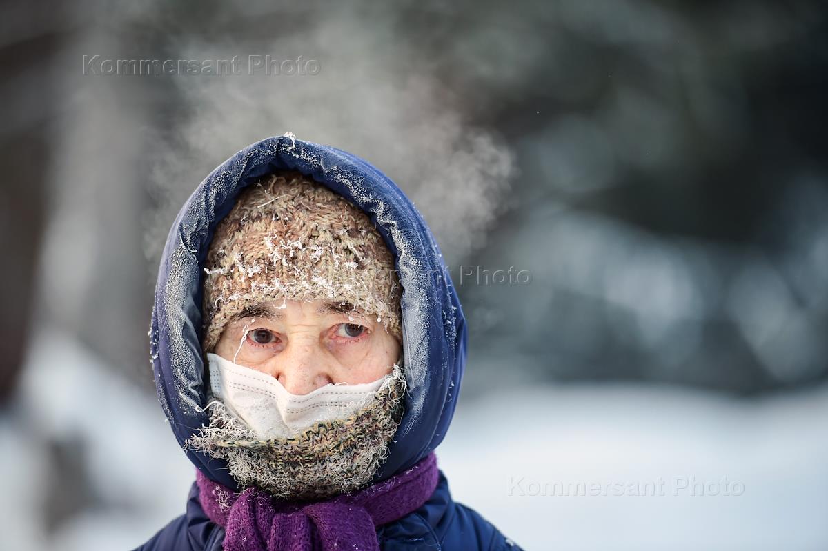 Виды Новосибирска во время морозов. Жанровая фотография. Пожилая женщина в обледенелом капюшоне и медицинской маске на улице во время сильного мороза.