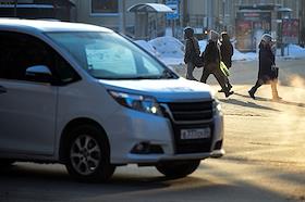 Виды Новосибирска во время морозов. Жанровая фотография. Горожане переходят дорогу по пешеходному переходу во время движения транспорта.