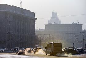 Виды Новосибирска во время морозов. Жанровая фотография. Автомобили во время движения в центре города.