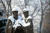 Виды Новосибирска. Жанровая фотография. Занесенный снегом памятник святым благоверным князьям Петру и Февронии Муромским в Нарымском сквере.