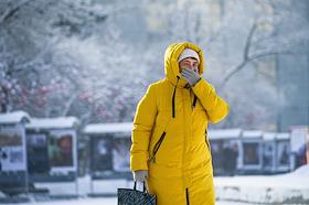 Виды Новосибирска во время морозов. Жанровая фотография. Женщина закрывает рукой лицо от мороза.