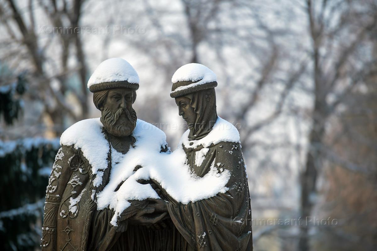 Виды Новосибирска. Жанровая фотография. Занесенный снегом памятник святым благоверным князьям Петру и Февронии Муромским в Нарымском сквере.