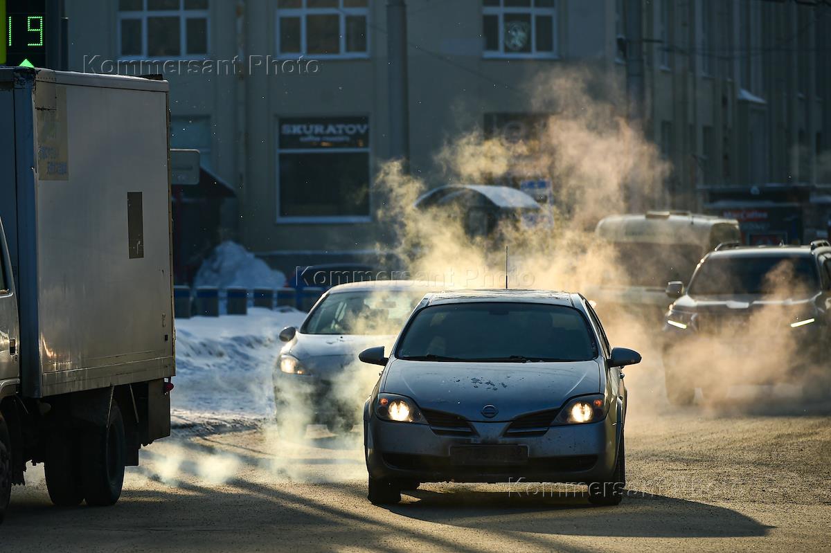 Виды Новосибирска во время морозов. Жанровая фотография. Движение автомобилей по улицам города.