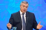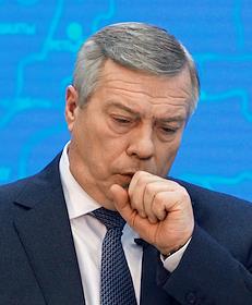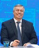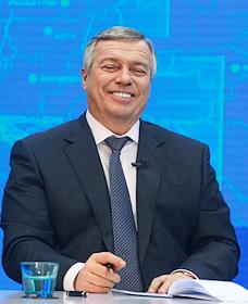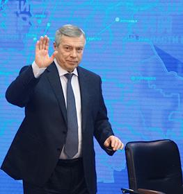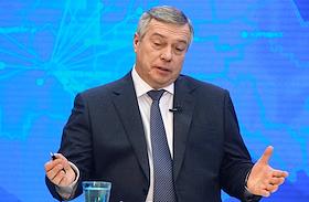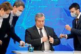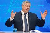 Governor of the Rostov Region Vasily Golubev (center) during the annual press conference on the results of the social and economic development of the Rostov Region in 2021 and plans for 2022.