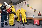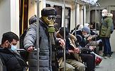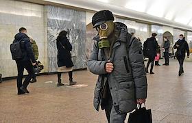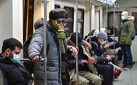Genre photography. Measures against the spread of coronavirus infection COVID-19 in Moscow. Passengers in a subway train car wearing protective face masks. A man in a gas mask.