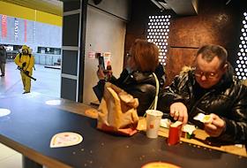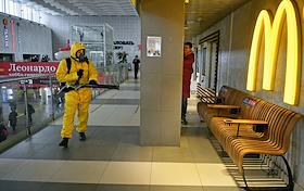 Measures to limit the spread of coronavirus infection COVID-19. Disinfection of the Leningradsky railway station and the territory adjacent to it. Genre photography. Patrons of McDonald's fast food restaurant.