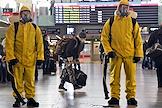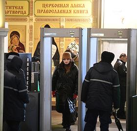 Genre photography. Passengers of the Leningradsky railway station enter the territory of the station through a metal detector frame.
