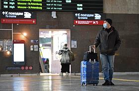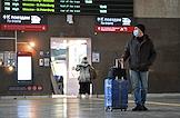 Genre photography. Passengers in the waiting room of the Leningradsky railway station in a protective mask on their faces.