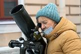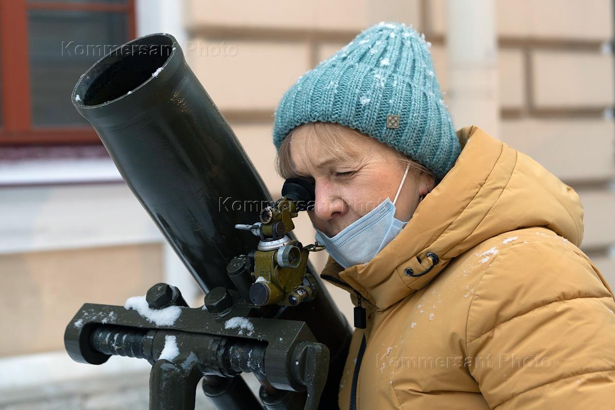 Мероприятия, посвященные 78 - годовщине снятия блокады Ленинграда в городе. Интерактивное представление "900 дней и ночей" во дворах Капеллы. Жанровая фотография. Женщина смотрит в телескоп.