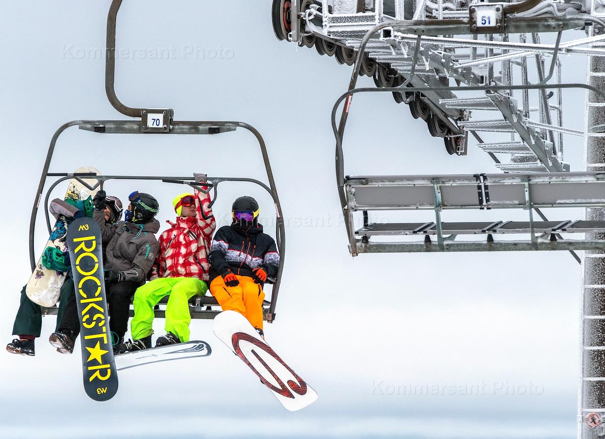 Жанровая фотография. Посетители круглогодичного курорта "Игора" на подъемнике перед спуском на горных лыжах.