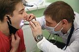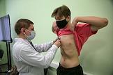 Жанровая фотография. Вакцинация подростков против коронавирусной инфекции COVID-19. Врач осматривает пациента перед вакцинацией.