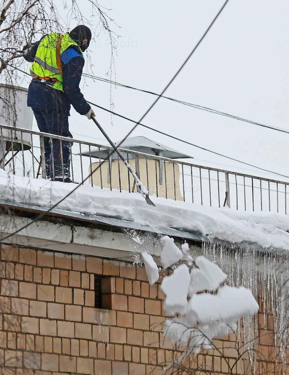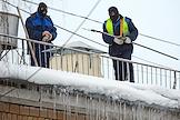 Жанровая фотография. Сотрудники коммунальных служб во время очистки крыш от снега и сосулек.