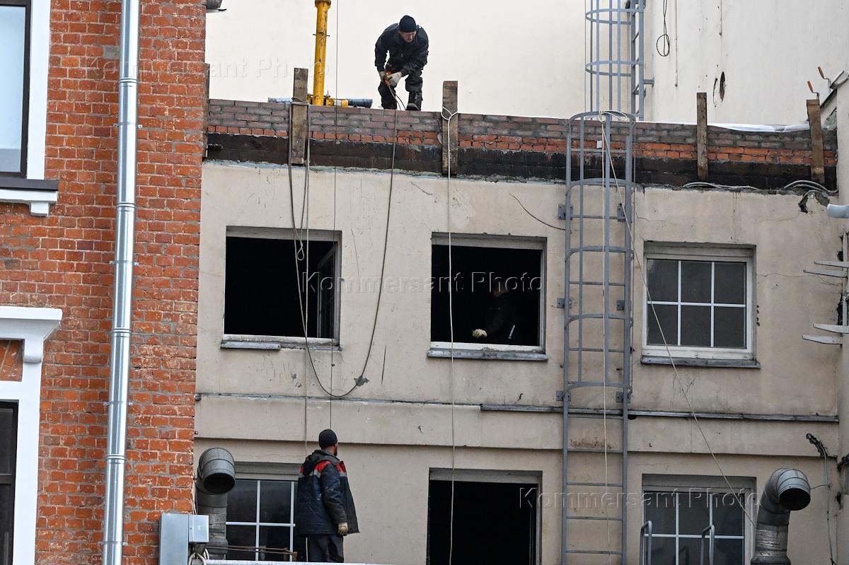 The building of the former photo center of the Union of Journalists of Russia on Gogolevsky Boulevard during reconstruction. Genre photography. Workers during domestic work.
