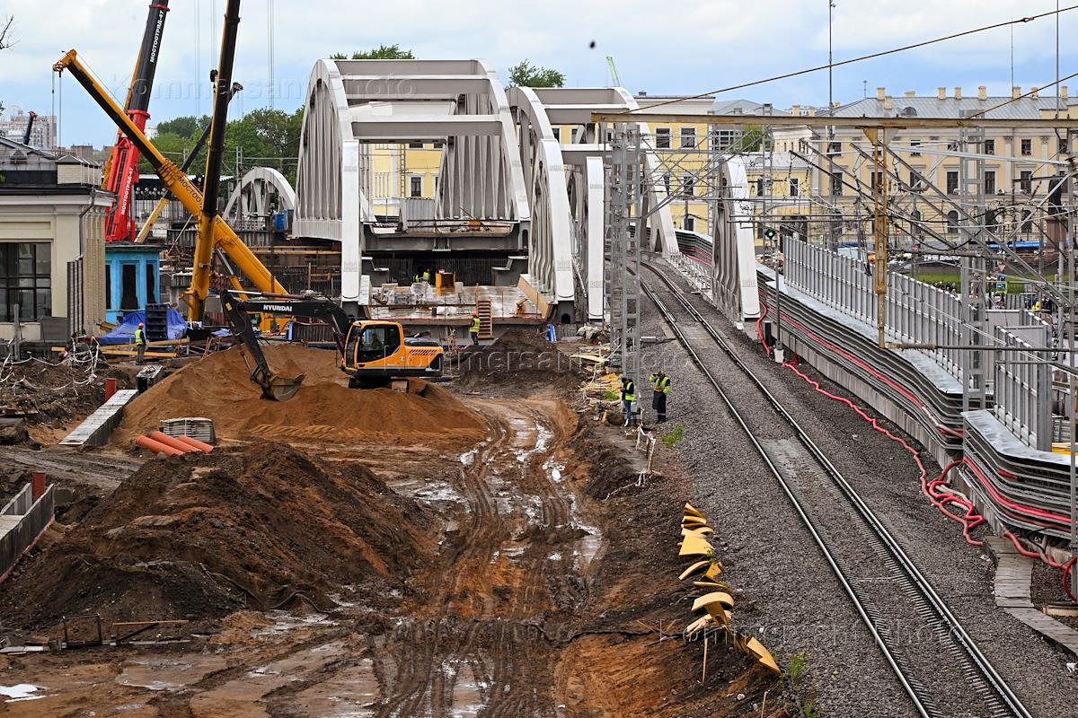 Genre photography. Construction workers cleaning the scenery after City Day celebrations on Manezhnaya Square.