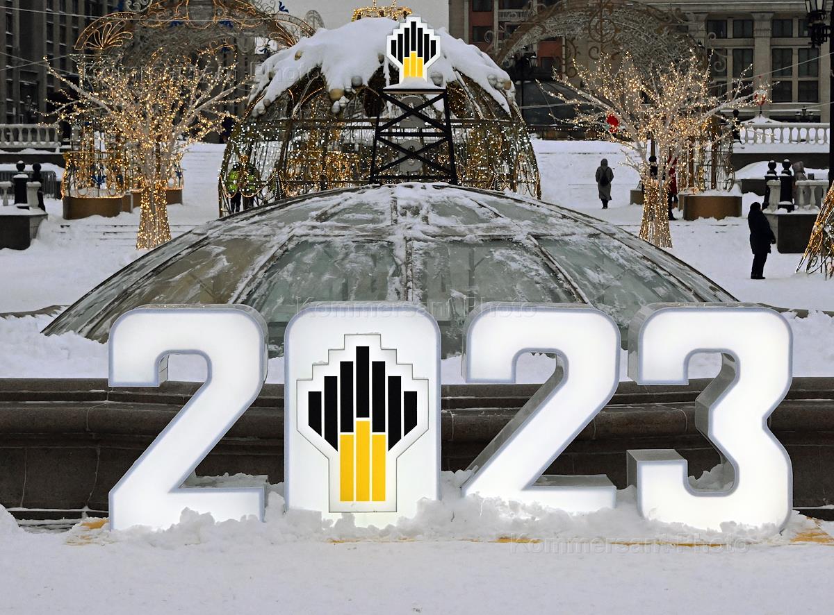 Views of Moscow. Genre photography. New Year tree and festive constructions with symbols of the oil company Rosneft on Manezhnaya Square.