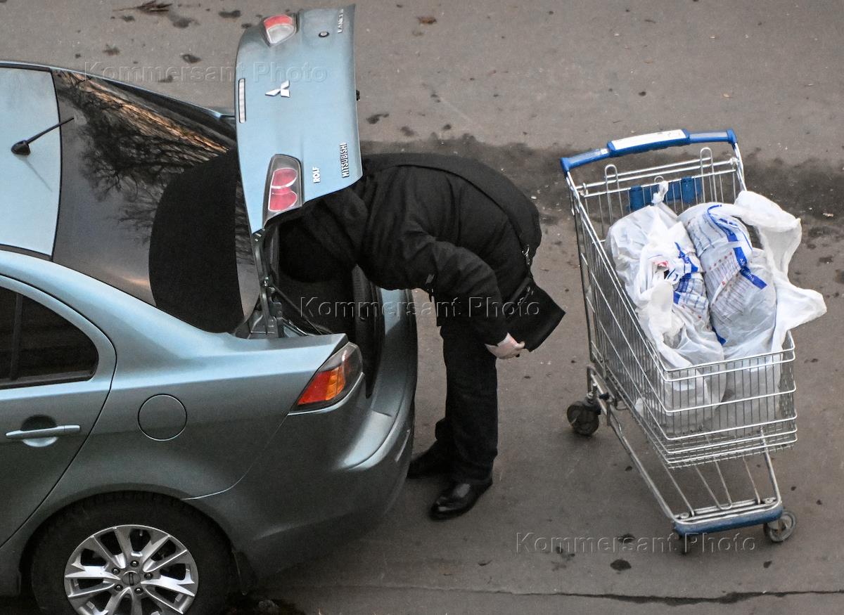 Genre photography. The man put his head in the trunk of a car.