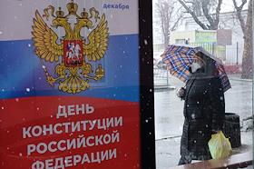 Жанровая фотография. Плакат с надписью "День Конституции России" и пожилая женщина в маске идет по улице под зонтом.