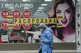 Жанровая фотография. Витрина с распродажей в магазине. Пожилая женщина в маске идет по улице.