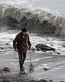 Жанровая фотография. Мужчина с металлоискателем ищет ценные металлы на берегу моря.