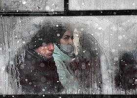 Жанровая фотография. Молодые люди едут в салоне автобуса.