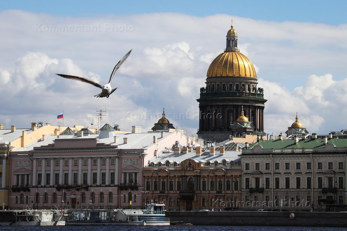 Виды Санкт-Петербурга. Жанровая фотография. Чайка над рекой Невой на фоне Исаакиевского собора.