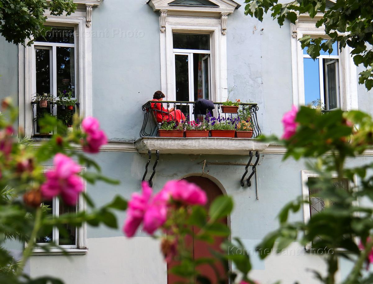 Жанровая фотография. Женщина слушает музыку в наушниках на балконе дома.