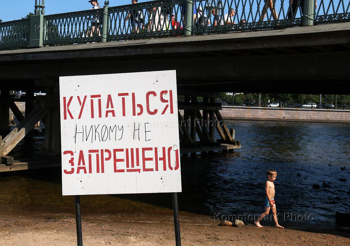 Жанровая фотография. Надпись "Купаться запрещено", переправленная в надпись "Купаться никому не запрещено" на берегу Кронверкского пролива.