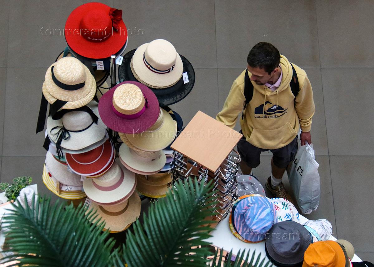 Жанровая фотография. Мужчина у прилавка с головными уборами.
