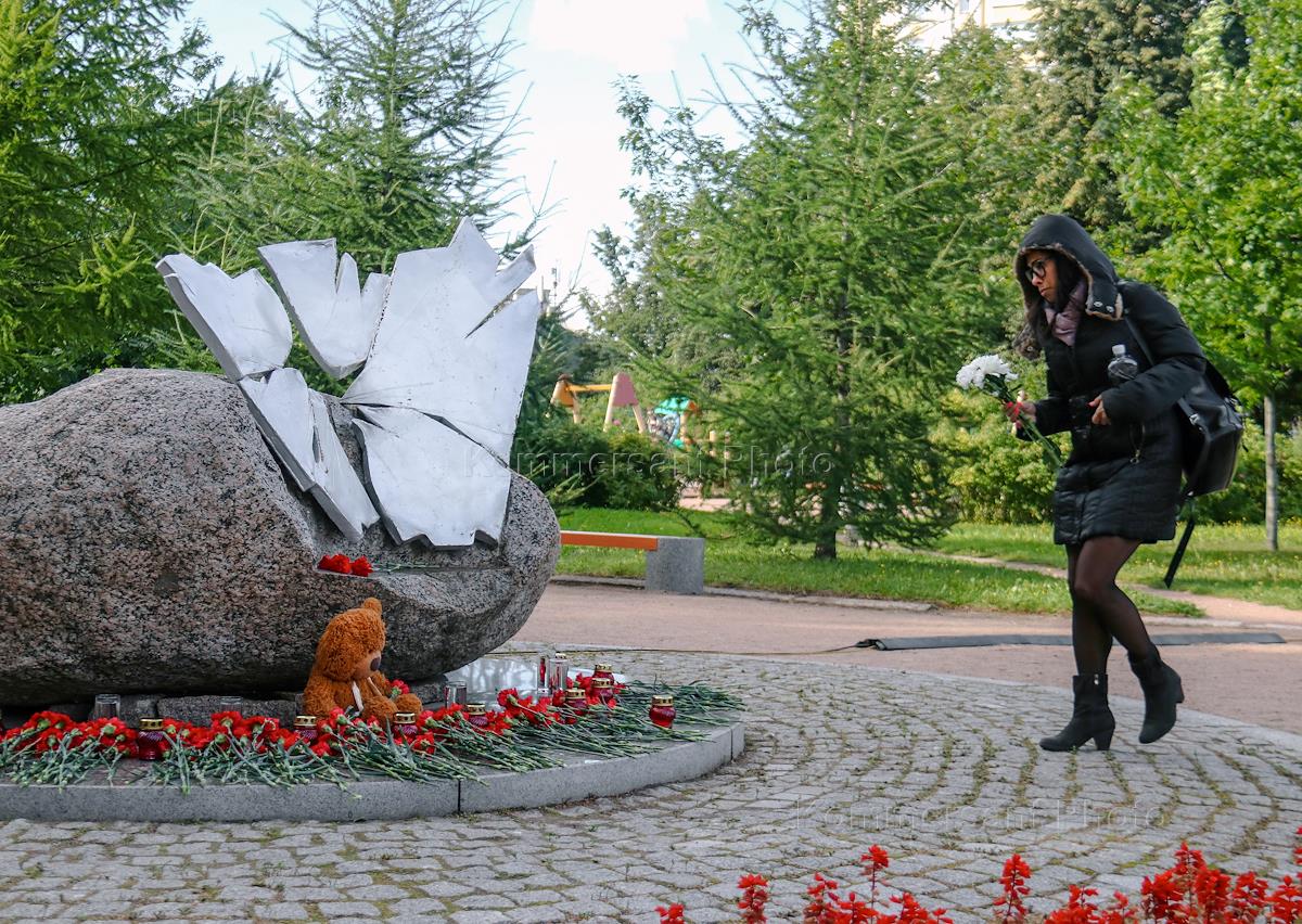 Акция памяти о жертвах захвата школы в Беслане. Женщина возлагает цветы к монументу "Камень Памяти".
