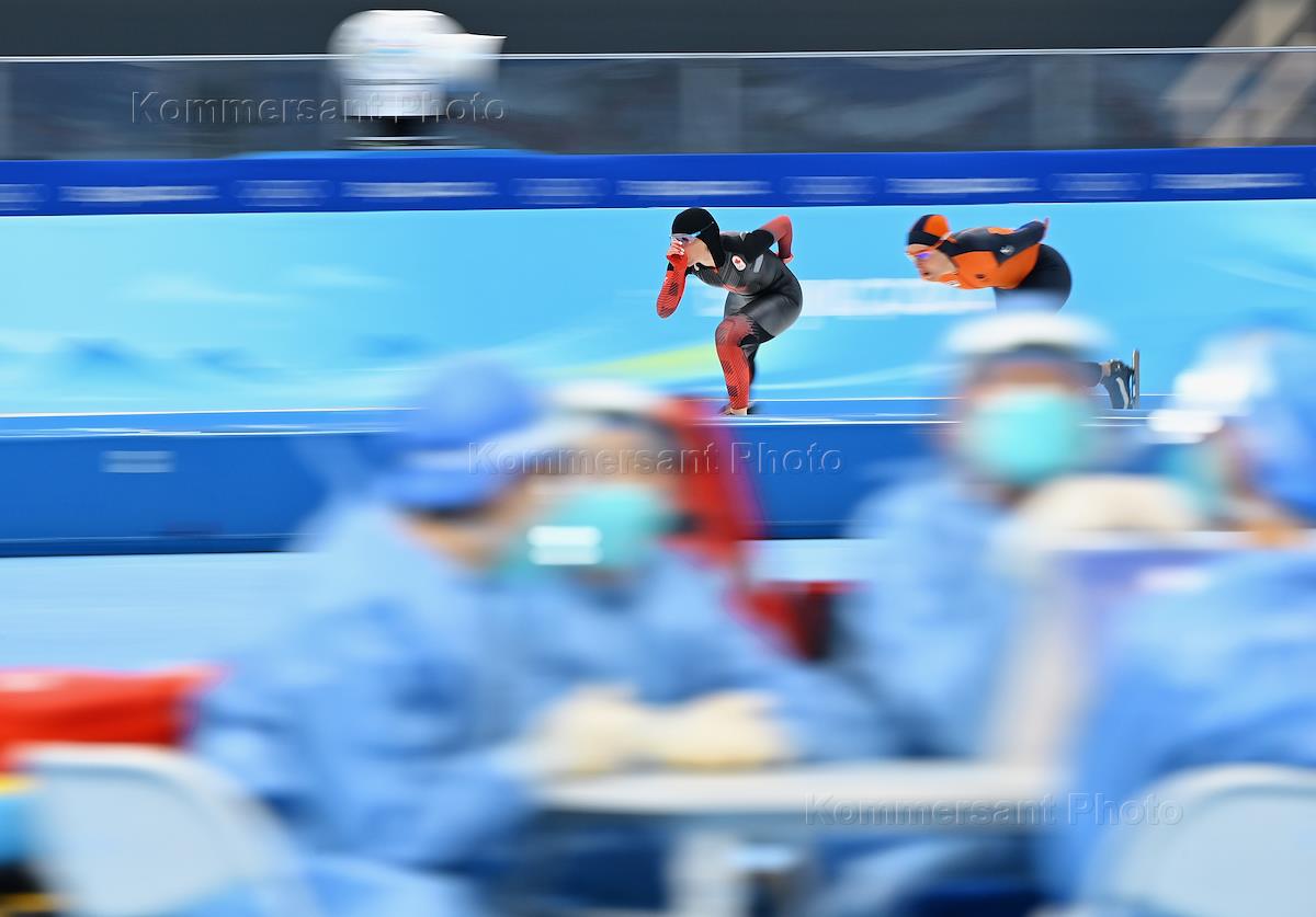 XXIV Winter Olympic Games in Beijing. Competition at a distance of 1500 meters among women in speed skating at the National Skating Stadium. Genre photography. The work of photographers in the competition.