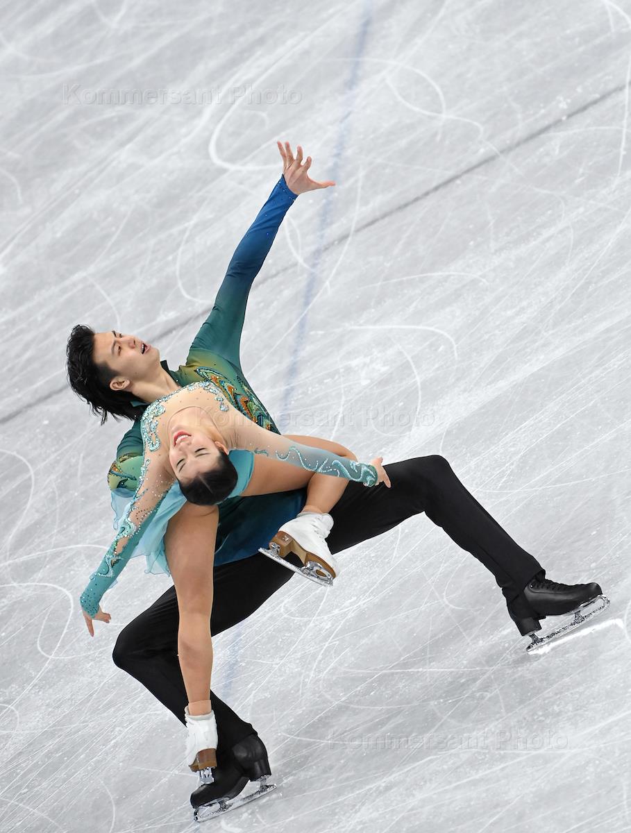XXIV зимние Олимпийские игры в Пекине. Командные соревнования по фигурному катанию в Столичном дворце спорта. Японские спортсмены Рику Миура и Рюити Кихара во время выступления с произвольной программой в парном катании.