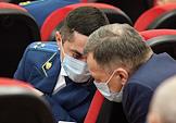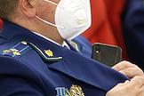 Итоговая коллегия прокуратуры Республики Татарстан по результатам работы за 2021 год. Жанровая фотография. Участник коллегии в защитной маске на лице.