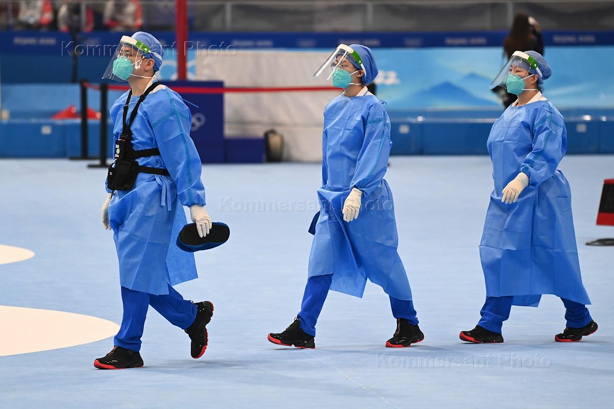 XXIV зимние Олимпийские игры в Пекине. Соревнования по конькобежному спорту в Национальном конькобежном Овале. Женщины. 5000 м. Медицинская бригада во время дежурства на соревновании.