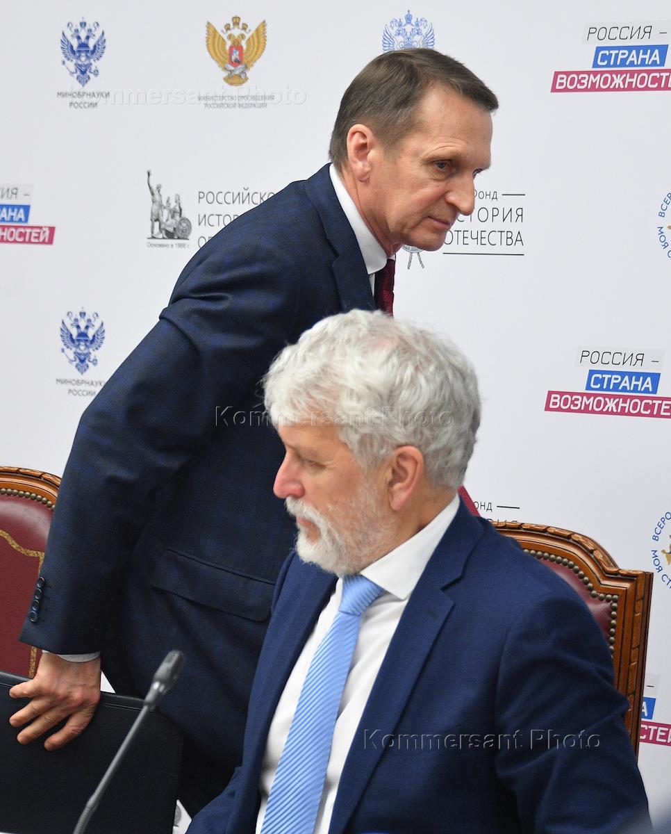 Meeting of the "round table" dedicated to the Year of Cultural Heritage of the Peoples of Russia in the House of the Russian Historical Society. Chairman of the Russian Historical Society Sergei Naryshkin (left) and Academician of the Russian Academy of Sciences, Manager of the Institute of Archeology of the Russian Academy of Sciences Nikolai Makarov (right) during a meeting.
