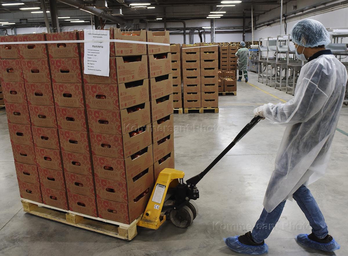 Тепличный комбинат "Белогорский" по производству свежих томатов во время начала фасовки нового сбора урожая.
