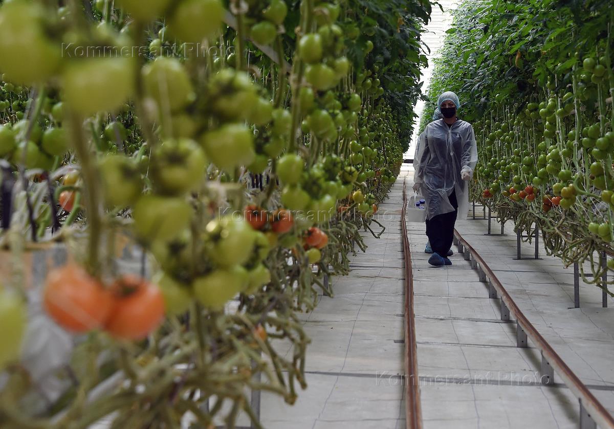 Тепличный комбинат "Белогорский" по производству свежих томатов во время начала сбора нового урожая.