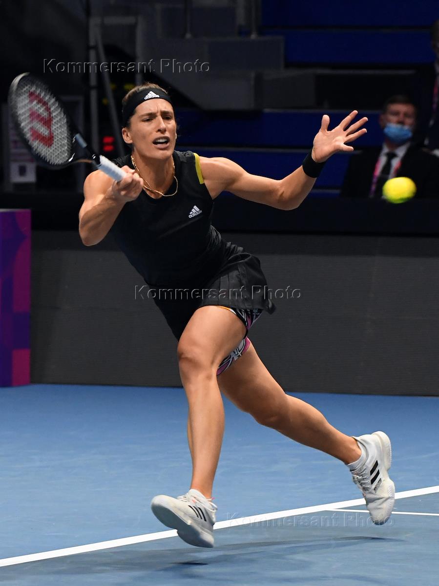 VII International Women's Tennis Tournament St Petersburg Ladies Trophy at Sibur Arena. German tennis player Andrea Petkovic during a match with Latvian tennis player Elena Ostapenko.