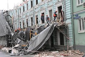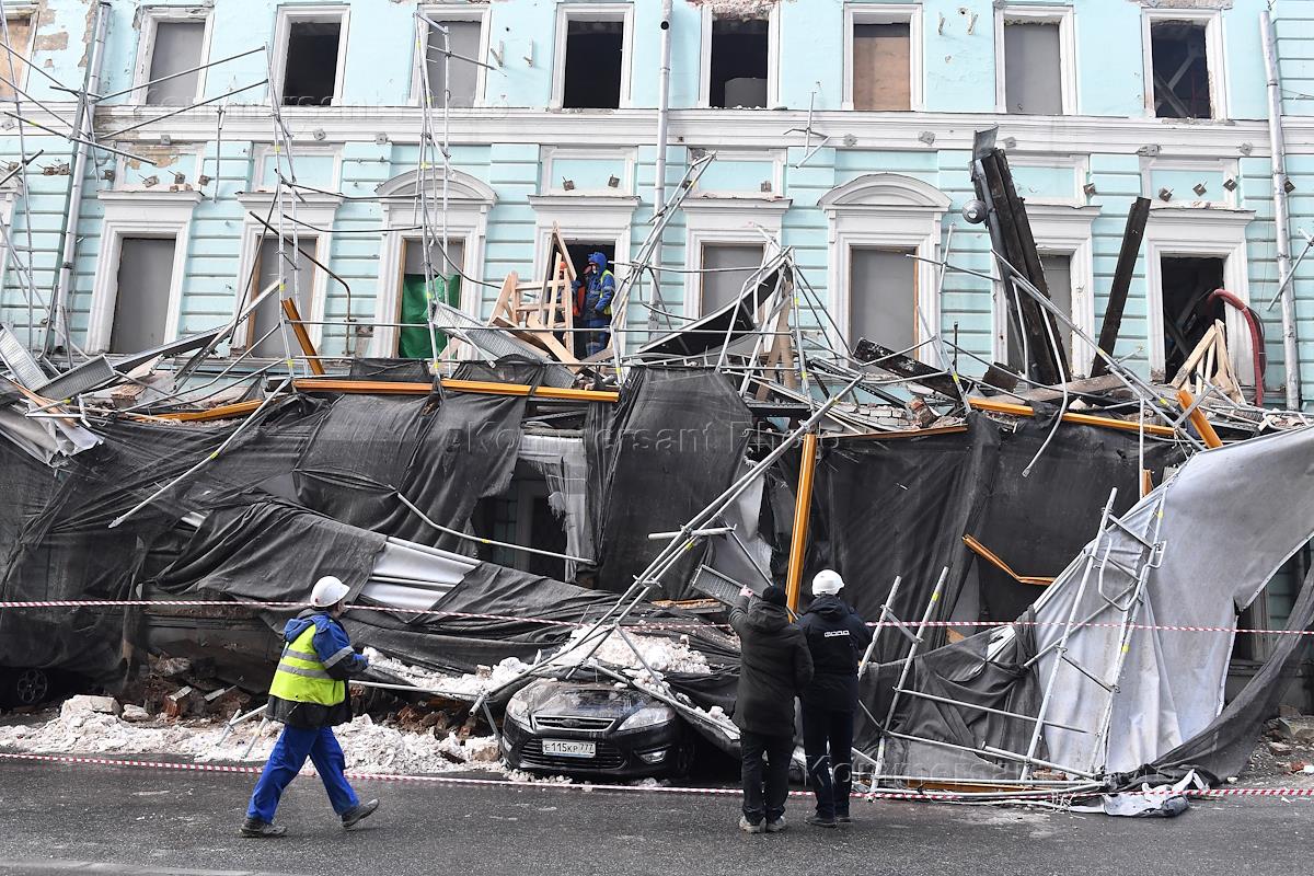 Последствия обрушения строительных лесов на припаркованные автомобили в Георгиевском переулке напротив здания Государственной думы России. Жанровая фотография. Рабочие во время разборки лесов.